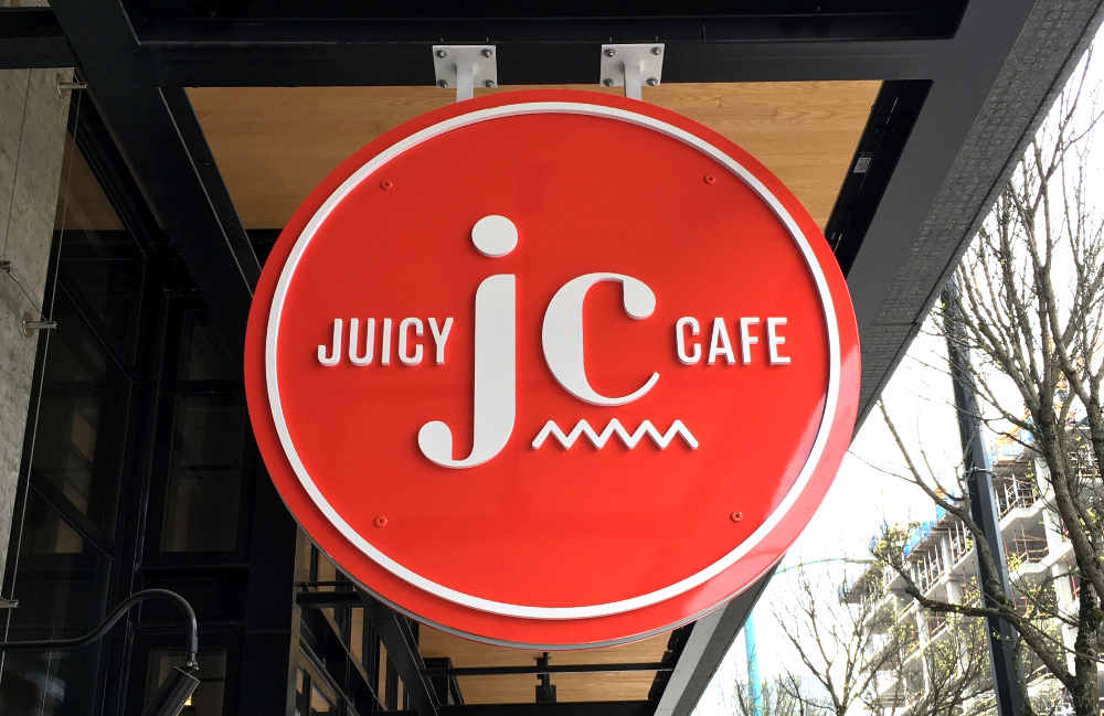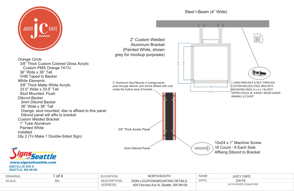 Worked with the owner of a cafe to design a hanging blade sign. Before the design could start, I had to work out the city code which determined how high the sign had to be from grade, and its total square footage. The logo was supplied in vector format, however their were a number of versions. I went back and forth with the customer for a few months before we settled on the current sign shape and materials/colors. I then designed a bracket to send to our welder and drafted a permit for the city which illustrated the signs method of attachment.