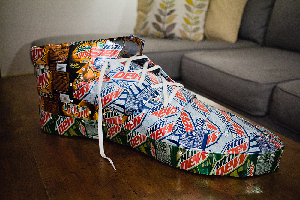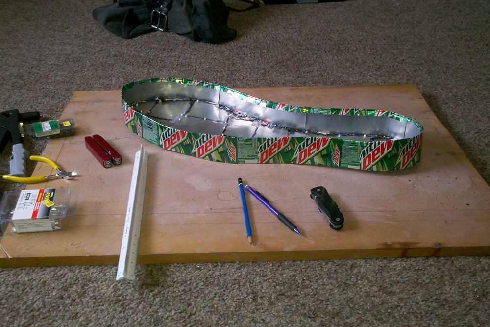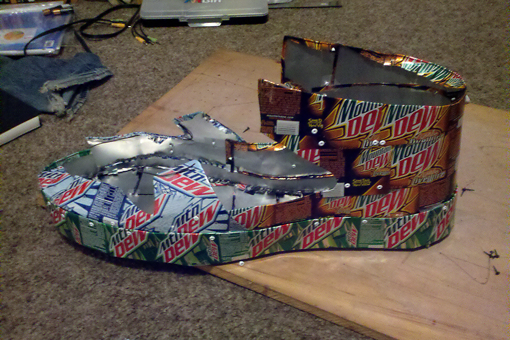 An exact 2:1 scale replica of a pair of shoes I owned (unfortunately not pictured). I chose to do each section of the shoe with a different colored can, since the shoes referenced did something similar. I used a piece of wood, nails, and a ruler to map out each section of the shoe. I then used wire coat hangers to form the outline of each section. After cutting the tops and bottom off of the cans, I cut them open and frayed the edges (to wrap around the wire) for the outside pieces, then pop-riveted the inner pieces to the outside. Overall I used ~75 cans and ~175 pop-rivets.